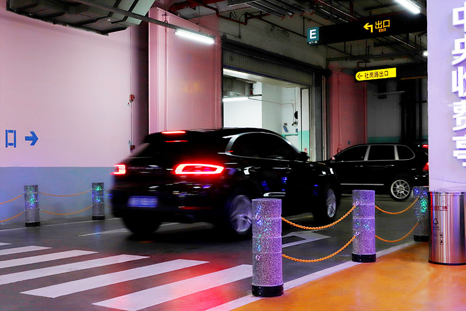 新型路障石材具有擋車功能,提升場所的形象和安全性,夜晚展現出特別絢麗的效果